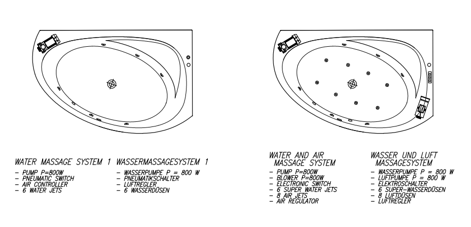 Все элементы системы водно-воздушного массажа объединены в комбинированную систему. Одновременная деятельность обеих систем интенсивно воздействует на организм человека, полностью регенерирует и расслабляет его. Система аэромассажа работает за счет воздушного насоса, создающего повышенное давление и поток воздуха через массажные форсунки. Струи разбивают воздух на мелкие пузырьки, которые смешиваются с водой и своей кинетической энергией интенсивно массируют тело.
