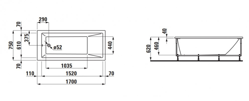 Ванна акриловая Laufen Pro 170х75 см встраиваемая с аэромассажем прямоугольная белый H2319510006051