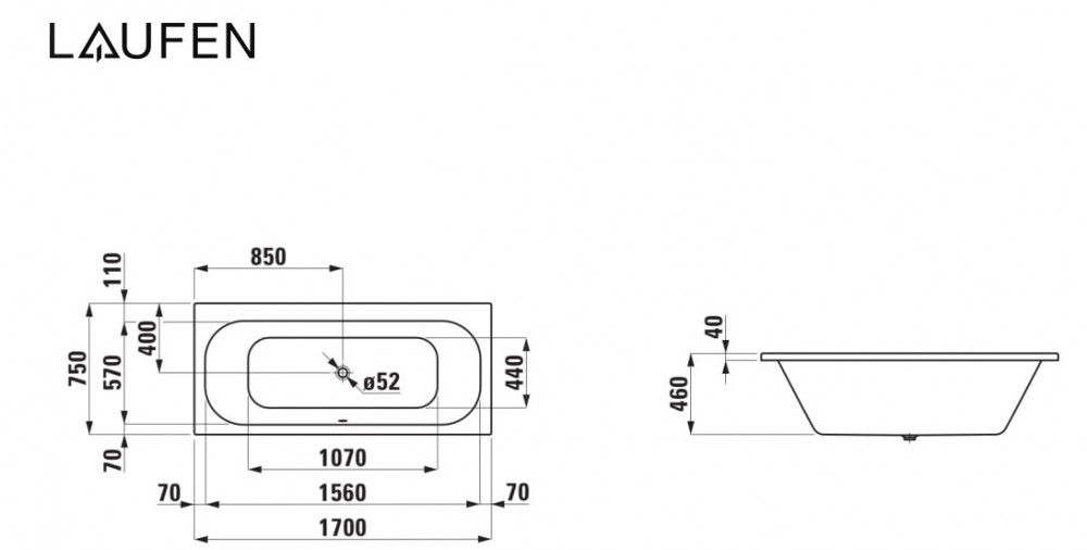 Ванна акриловая Laufen Solutions 170х75 см встраиваемая прямоугольная белый H2235300000001