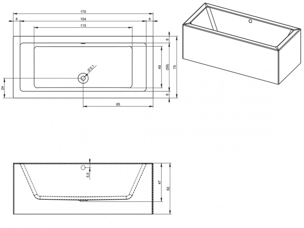 1) Ванна акриловая Riho Lugo Plug & Play прямоугольная 170x75 правая с панелью