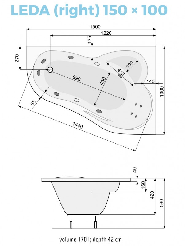 Ванна акриловая угловая PoolSpa коллекция Leda 150х100 R правая с ножками белый PWAE410ZN000000