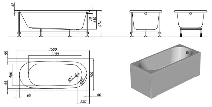 1) Ванна акриловая встраиваемая прямоугольная Kolpa-San Tamia 150х70 см белый