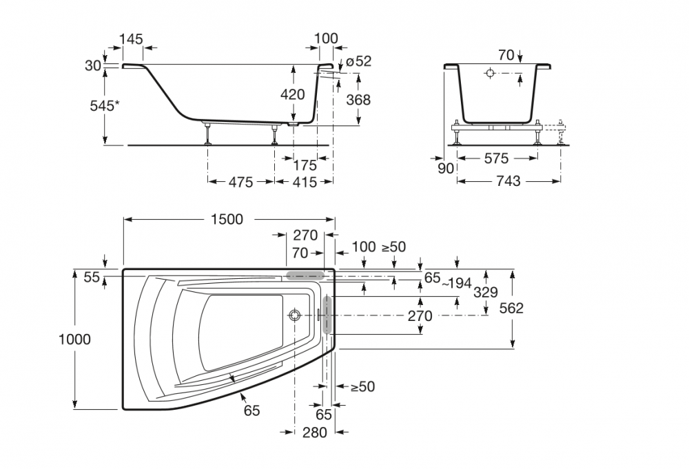 Угловая акриловая ванна Roca Hall 150x100 левая с гидромассажем Smart Water Plus + подголовник + сифон A24T401000