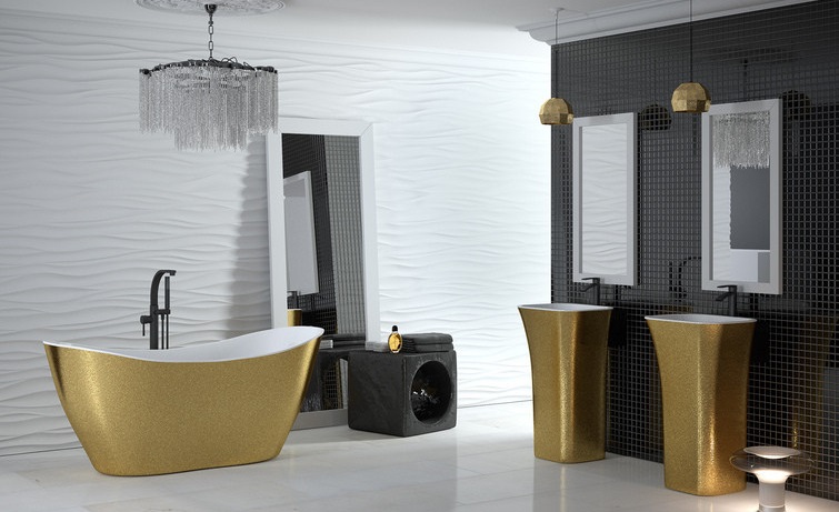 Ванна из искусственного камня Besco Viya Glam 160х70 см с сифоном клик-клак хром Mineral DuraBe золото/белый глянцевый #WMD-160-VZ