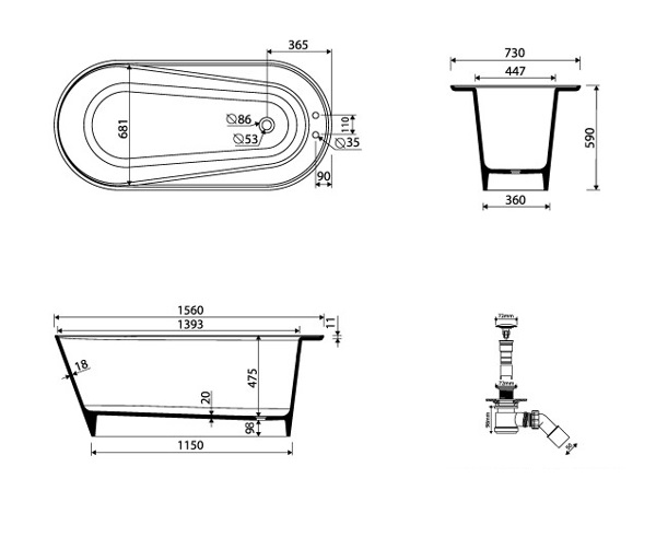 - Габаритные размеры ванны: 1560x730x590 мм