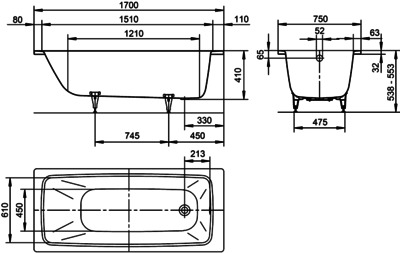 1) Ванна стальная Kaldewei Cayono 170x75 см 3,5 мм 206 л белый