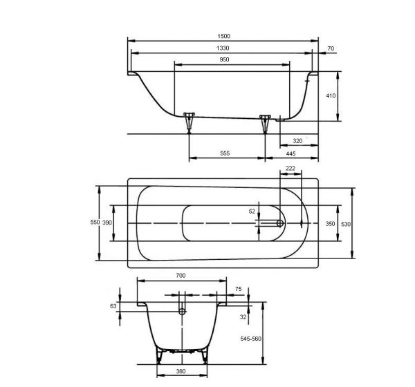 1) Ванна стальная Kaldewei Saniform Plus 150х70 см 3,5 мм 152 л белый