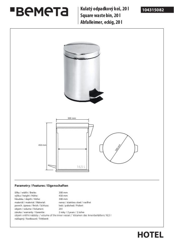 Ведро для мусора Bemeta Hotel 20 л нержавеющая сталь хром 104315082