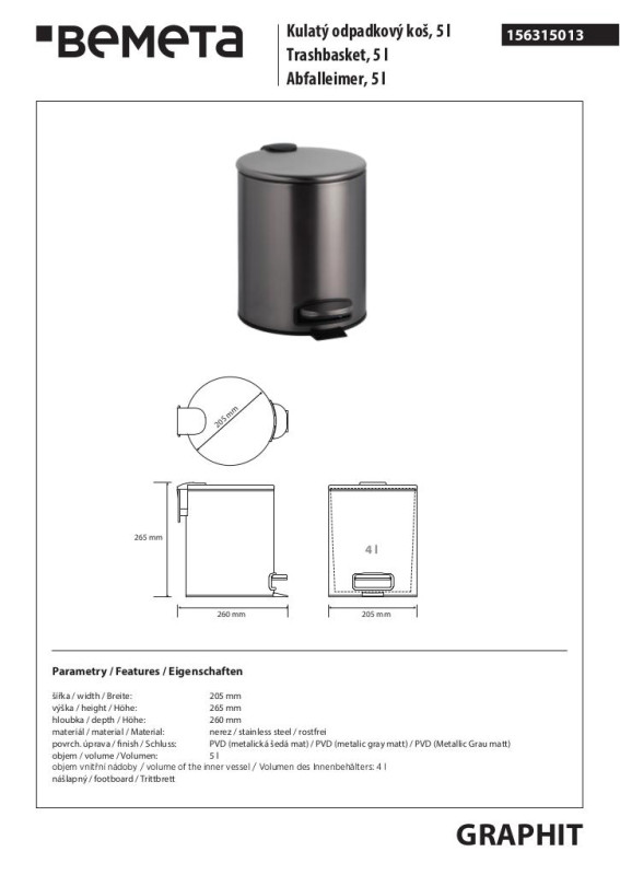 Ведро для мусора Bemeta Hotel 5 л нержавеющая сталь графит матовый 156315013