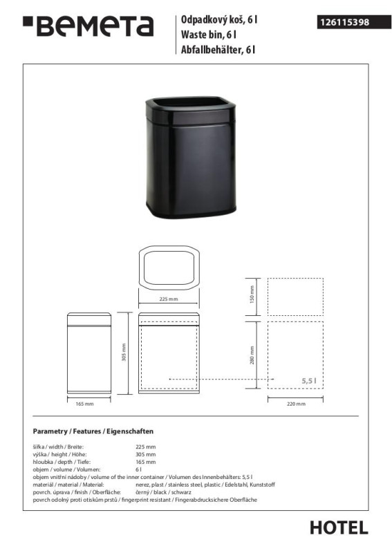 Ведро для мусора Bemeta Hotel 6 л нержавеющая сталь черный 126115398