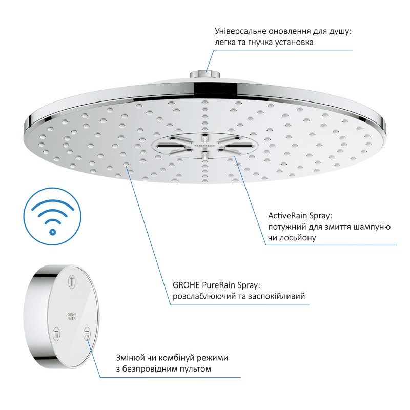 - 2 вида струй: GROHE PureRain, ActiveRain