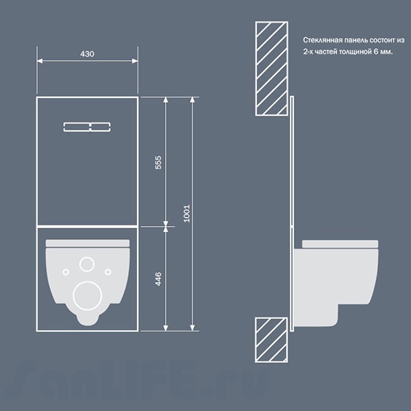 - Особенности: монтаж только вместе с нижней стеклянной панелью для установки унитаза