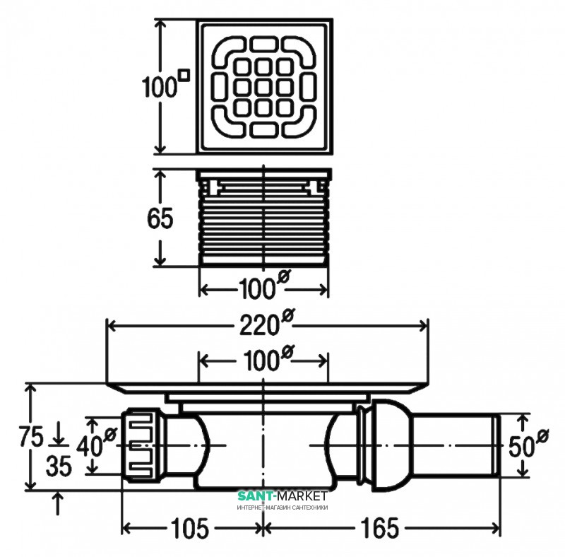 Сливной трап для душа Viega Advantix мокрый затвор боковой выпуск 100x100 557119