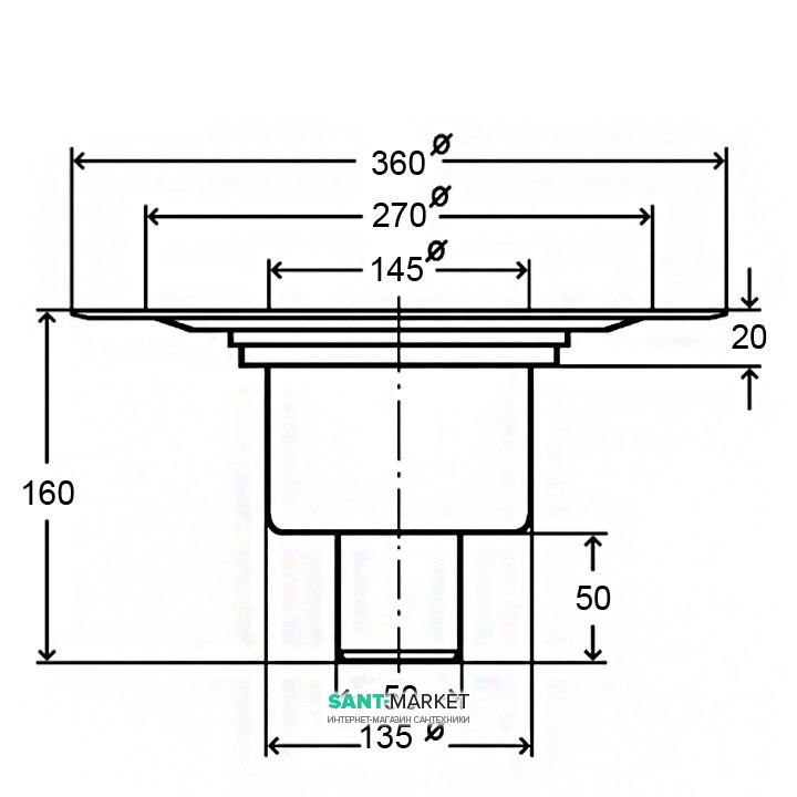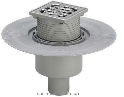 Трап для душевой с изоляционным фланцем, пропускная способность 1,5 л/с, с гидрозатвором (высота водяного столба 30 мм), с вращающейся и регулируемой по высоте насадкой 100х100 мм, с решеткой из нержавеюшей стали, предельно допустимая нагрузка класса К = 300 кг, с защитной заглушкой, c шарнирным отводом.