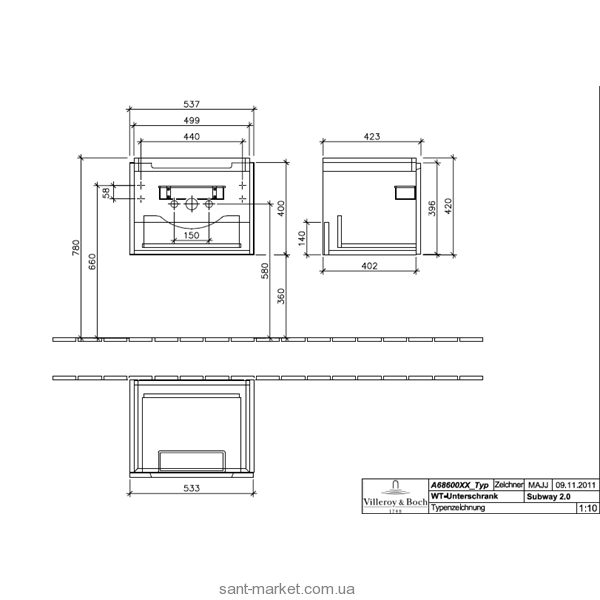 Тумба под раковину Villeroy&Boch Subway 2.0 подвесная 53.7x42.3x42 белая A68600DH
