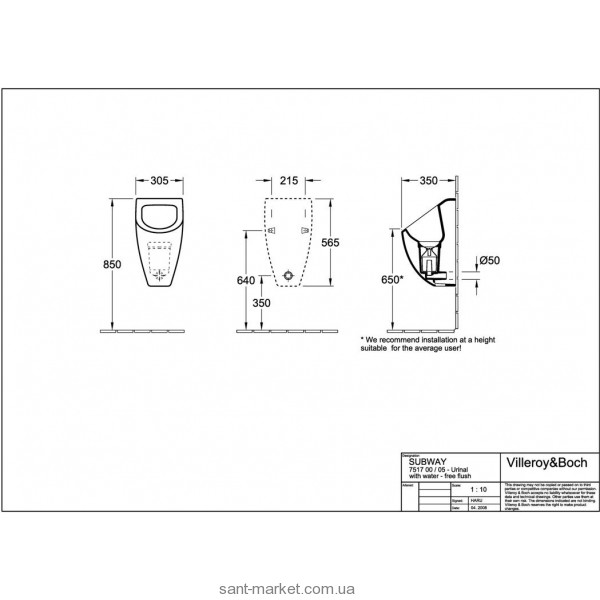Писсуар безводный Villeroy&Boch коллекция Subway без крышки 75170001
