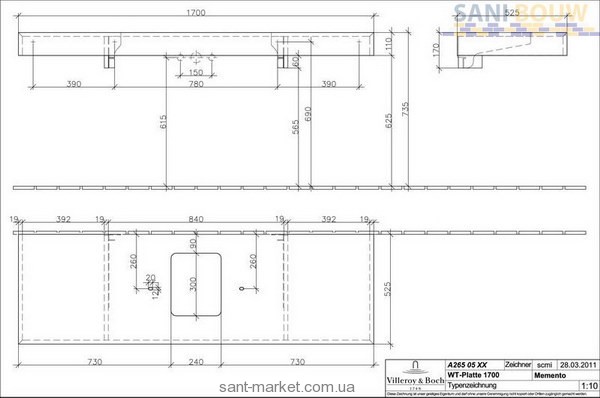 Villeroy&Boch Memento Столешница под двойную раковину 1700 x 110 x 525 A26505FC