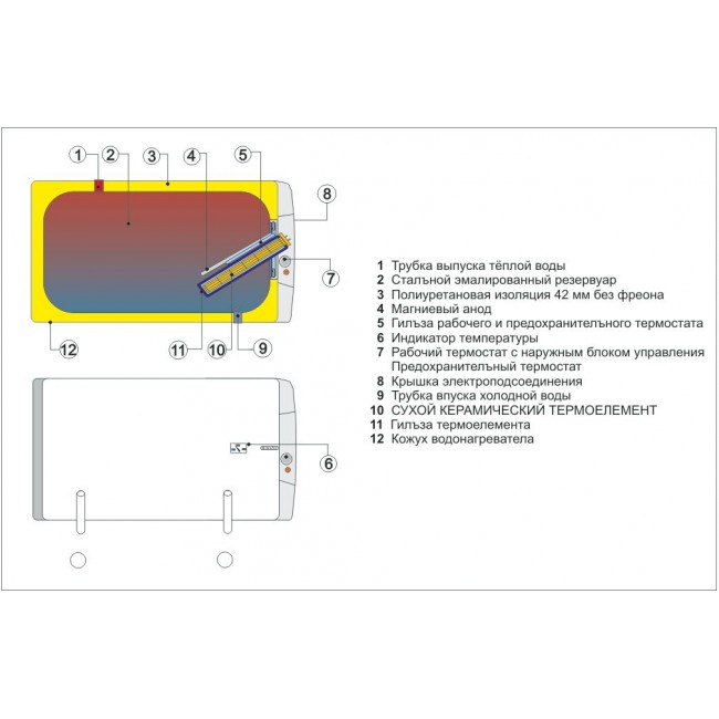 - Внутренняя поверхность бака покрыта высококачественной эмалью без содержания никеля, что в сочетании с защитным магниевым анодом обеспечивает долговечность работы водонагревателя.