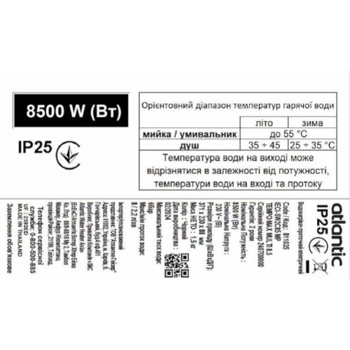 Водонагреватель проточный Atlantic Tempo Max Multi IECI-SW2C85 MP 8.5 kW черный 811035