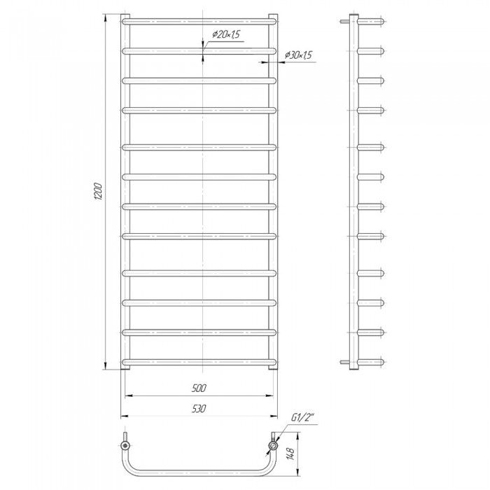 Водяной полотенцесушитель Mario Стандарт 1200x530/500 мм нержавеющая сталь