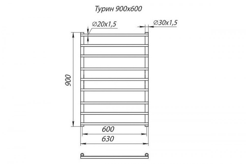 Водяной полотенцесушитель Турин 900х600 с межосевым растоянием для подключения 600мм, диметр подключения G 1/2'' состоит из 9 ребер.