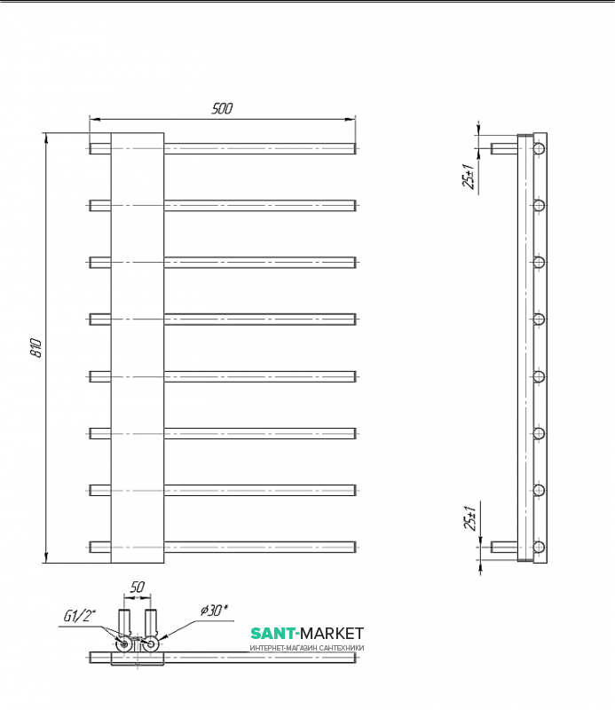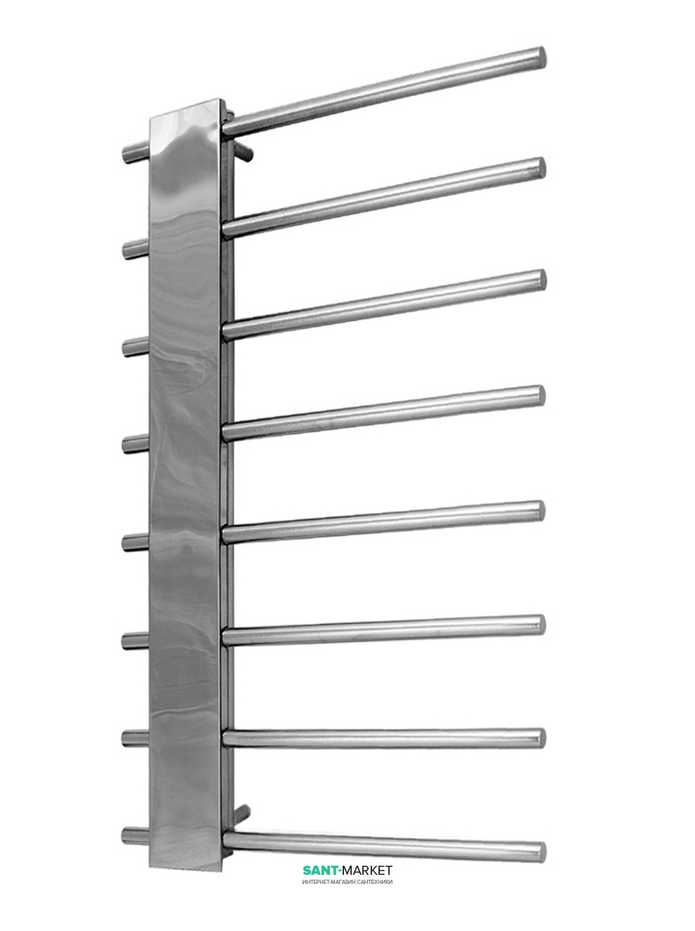 Водяной полотенцесушитель Комфорт 810x500 с межосевым расстоянием для подключения 50 мм, диаметр подключения G 1/2'' состоит из 8 ребер. Дизайн-радиатора Комфорт производственного предприятия Mario изготовлен из нержавеющей стали АІSI 304 может быть оборудован электрическим теном.
