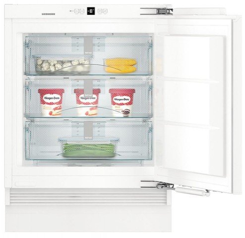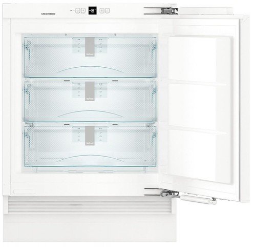 Встраиваемый морозильник (морозильная камера) Liebherr SUIGN 1554 Premium NoFrost с кнопочным управлением и тремя выдвижными контейнерами. Выбранные температурные настройки отображает ЖК-дисплей MagicEye. О неисправностях и неплотно закрытой дверце сообщает световая и звуковая сигнализация. Выправить вертикальное положение SUIGN 1554 можно с помощью регулируемых по высоте ножек.
