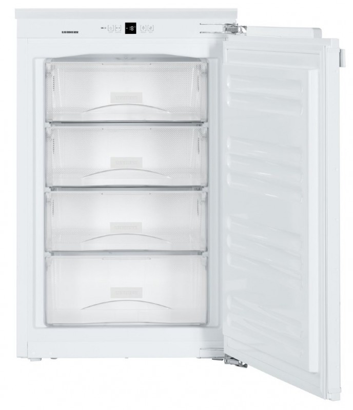 Встраиваемый морозильник (морозильная камера) Liebherr IG 1624 Comfort с кнопочным управлением и 4 выдвижными контейнерами. Выбранные температурные режимы отображает дисплей MagicEye. О поломках и неплотно закрытой дверце оповещает световая и звуковая сигнализация. Выровнять вертикальное положение IG 1624 возможно при помощи регулируемых по высоте ножек.