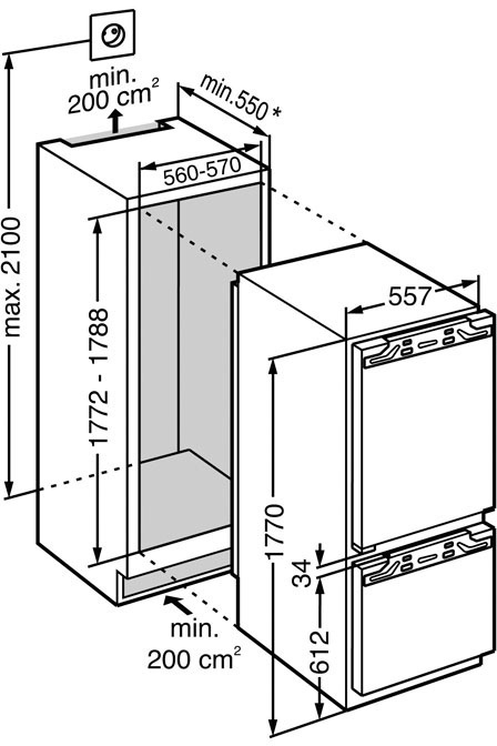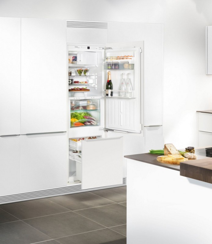 Холодильные камеры можно без труда разместить за фасадом кухонного гарнитура, благодаря чему они будут прекрасно гармонировать с Вашим кухонным гарнитуром. При этом необходимо соблюдать технологию монтажа встраиваемой техники. Монтаж фиксированной дверцы: мебельная дверца и дверца прибора крепятся друг к другу, при этом мебельная дверца крепиться непосредственно на дверцу холодильника. Монтаж буксируемой дверцы: Мебельная дверца закреплена непосредственно на высоком шкафу и соединяется с дверцей холодильника при помощи скользящей шины. При открывании и закрывании мебельная дверца скользит вдоль шины.