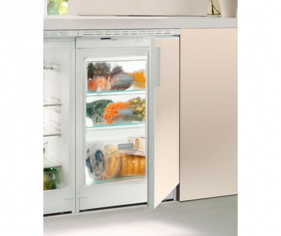 Выдвижные контейнеры FrostSafe отличаются особенно высоким исполнением и закрытой конструкцией. Благодаря этому в контейнерах дольше сохраняется холод при открывании двери. Прозрачная передняя панель контейнера обеспечивает оптимальный обзор хранящихся в нем замороженных продуктов.