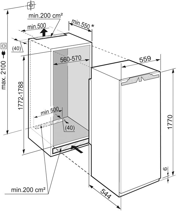Холодильные камеры можно без труда разместить за фасадом кухонного гарнитура, благодаря чему они будут прекрасно гармонировать с Вашим кухонным гарнитуром. При этом необходимо соблюдать технологию монтажа встраиваемой техники. Монтаж фиксированной дверцы: мебельная дверца и дверца прибора крепятся друг к другу, при этом мебельная дверца крепиться непосредственно на дверцу холодильника. Монтаж буксируемой дверцы: Мебельная дверца закреплена непосредственно на высоком шкафу и соединяется с дверцей холодильника при помощи скользящей шины. При открывании и закрывании мебельная дверца скользит вдоль шины.