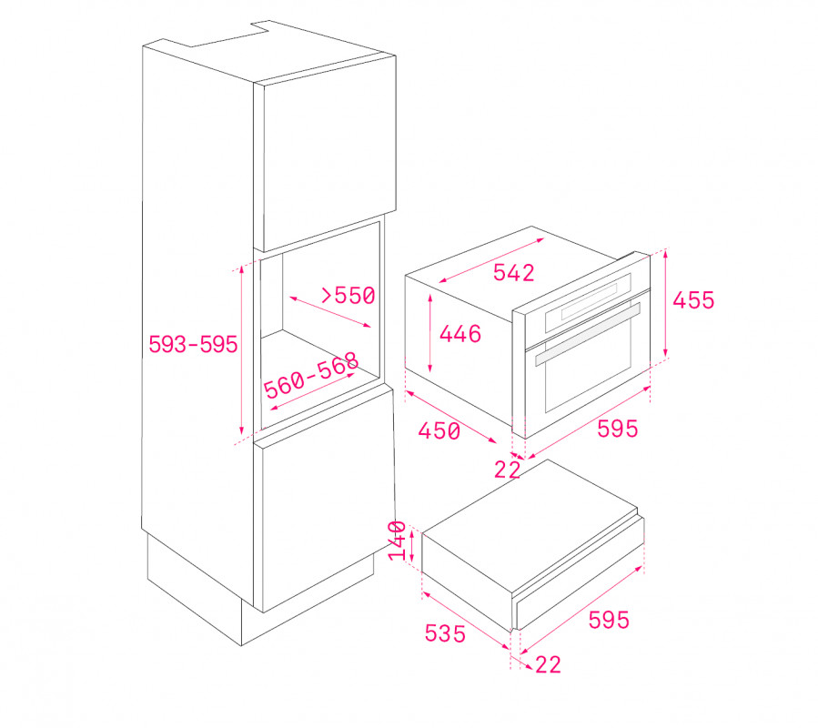 - Внешние размеры (ВхШхГ): 140x595x557 мм