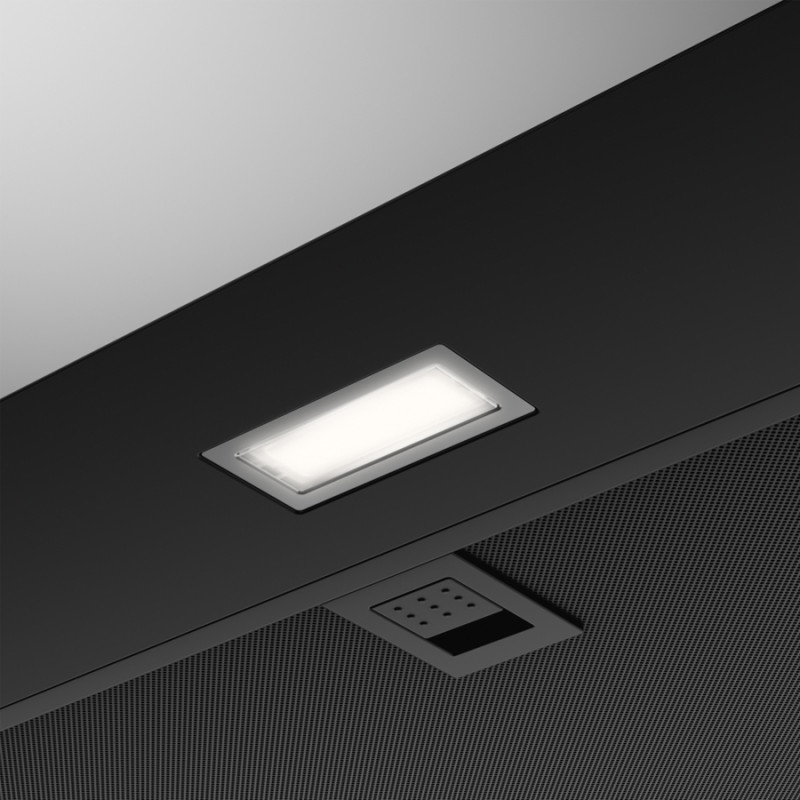 Вытяжка для встраивания в шкафчик с электронным управлением и периметральным втягиванием воздуха. Возможен незаметный монтаж заподлицо с дном шкафчика.