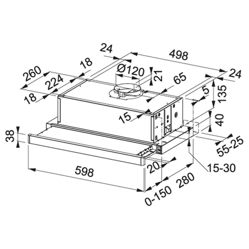 Размеры: Длина 598 мм. Ширина 280-430 мм. Высота 175 мм. Вырез воздуховода Ø120 мм.