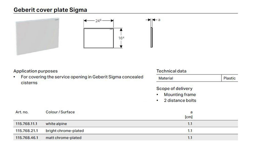 - для использования со всеми типами инсталяций и бачков Geberit Sigma 12 см (UP300), Geberit Sigma 8 см (UP700 и UP720)