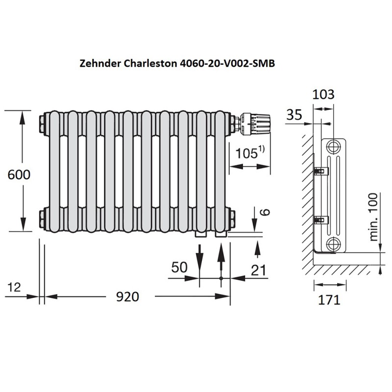 Радиатор центрального отопления Zehnder Charleston 1196 x 600 белый 3060-26-9016-V002-SMB