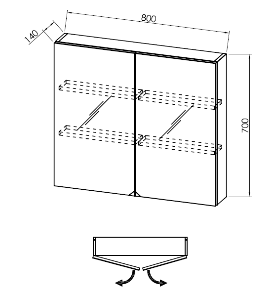 две распашные дверцы, две полки