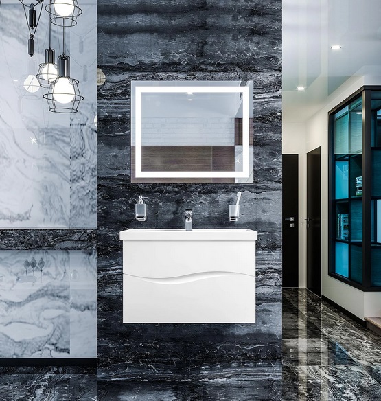 Зеркальные полотна толщиной 4 мм произведены бельгийской компанией «AGС». Покрыты амальгамой на основе серебра, отличаются повышенной влагостойкостью. Пескоструйный рисунок по периметру подсвечивается светодиодами. Зеркала идеально сочетаются с тумбами для умывальников компании «Аква Родос» разных размеров.