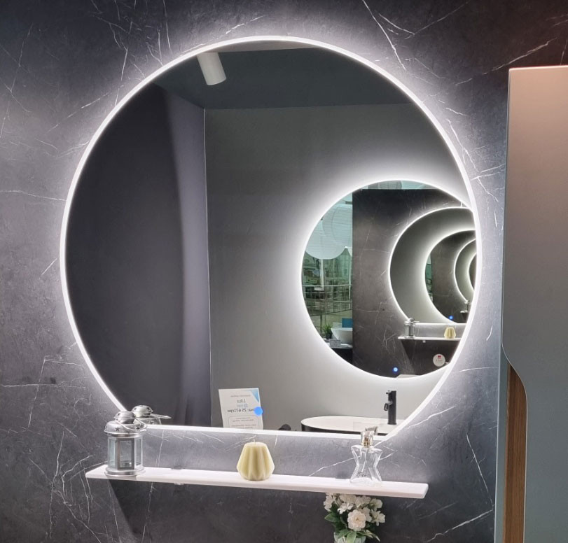 Часть света направляется во все стороны параллельно поверхности зеркала, красиво освещая мягким свечением стену вокруг изделия. Так называемый эффект «амбилайт». Другая часть исходит из световой кромки шириной 5 мм по всему периметру изделия, освещая человека, который пользуется зеркалом. Подсветка включается при помощи тач-сенсора. Сенсор касания (тач-сенсор) в виде светящейся кнопки располагается на лицевой поверхности зеркала. Подсветка включается и выключается в момент касания сенсора рукой.
