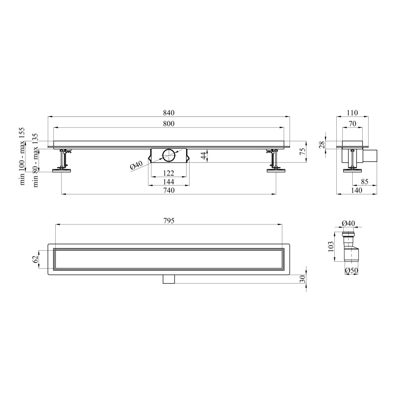 Желоб водосточный Kroner KRP Eifel-F80Fliese с решеткой 800 мм нержавеющая сталь CV034174